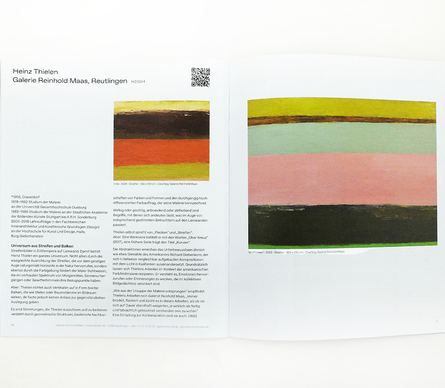 2026Dorothee Baer-Bogenschütz: »Universum aus Streifen und Balken«, in: re:discover, Katalog zum gleichnamigen Förderprogramm der art karlsruhe 2026, Bundesverband Deutscher Galerien und Kunsthändler e. V. (BVDG)